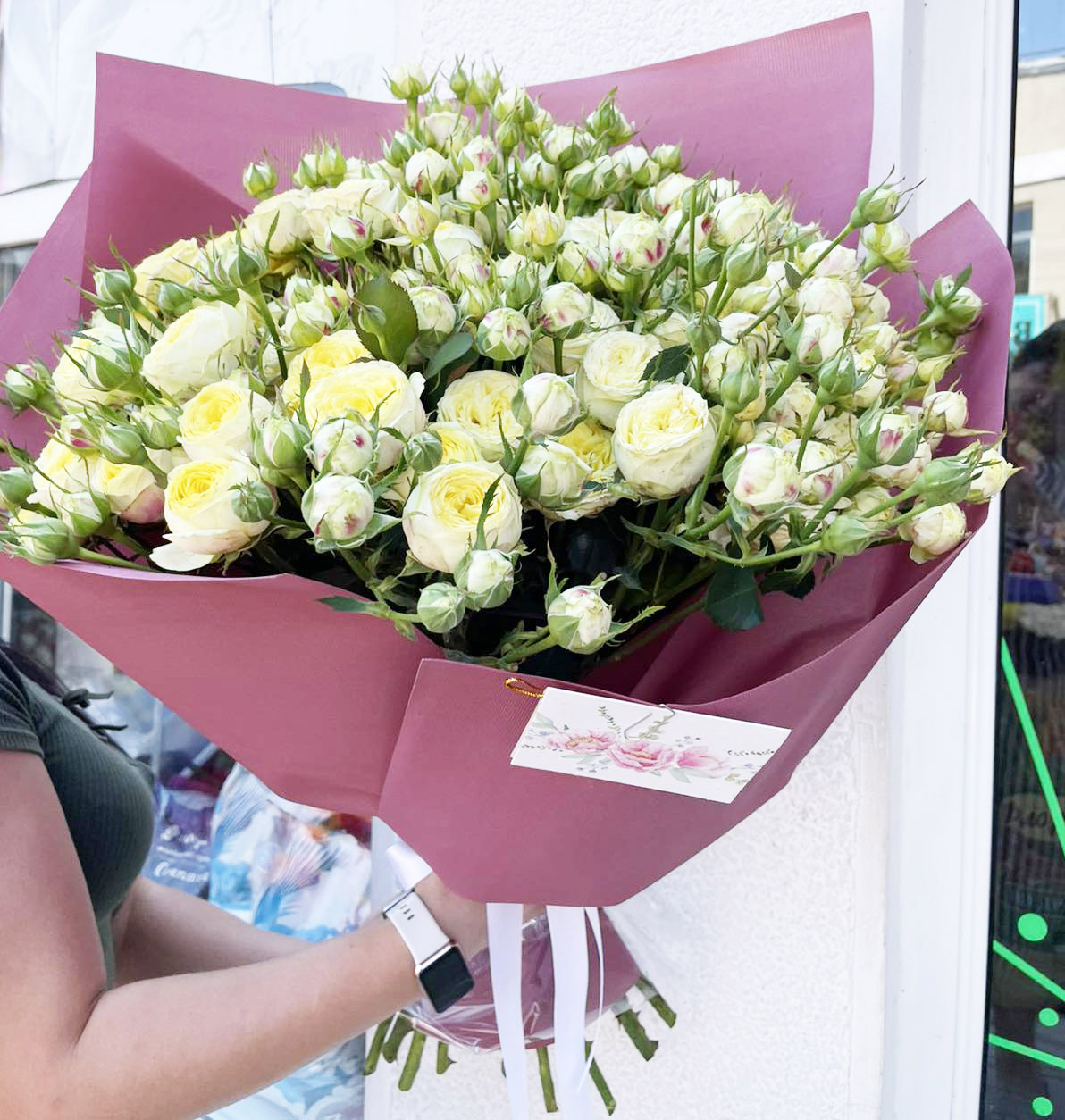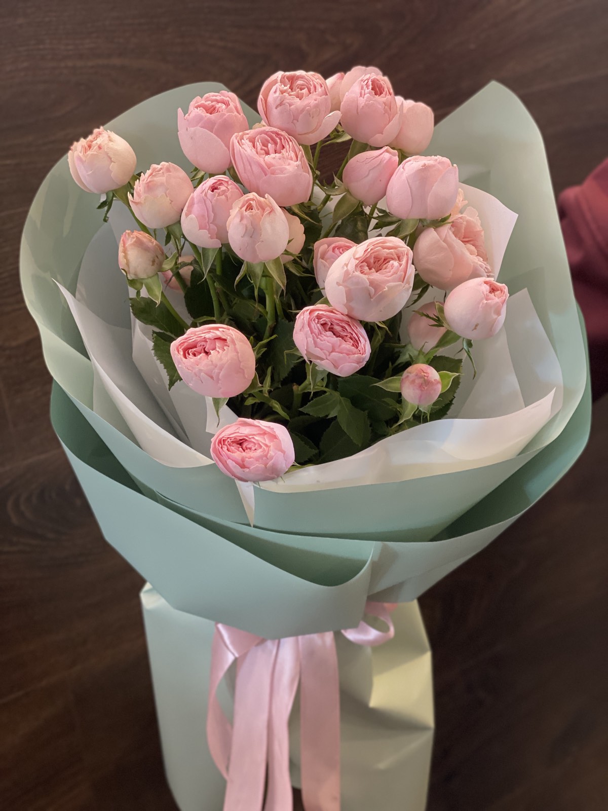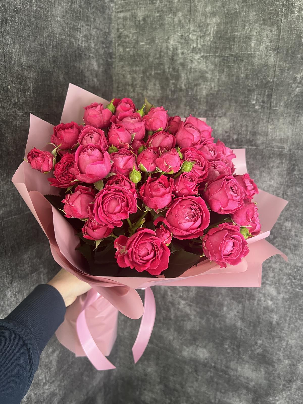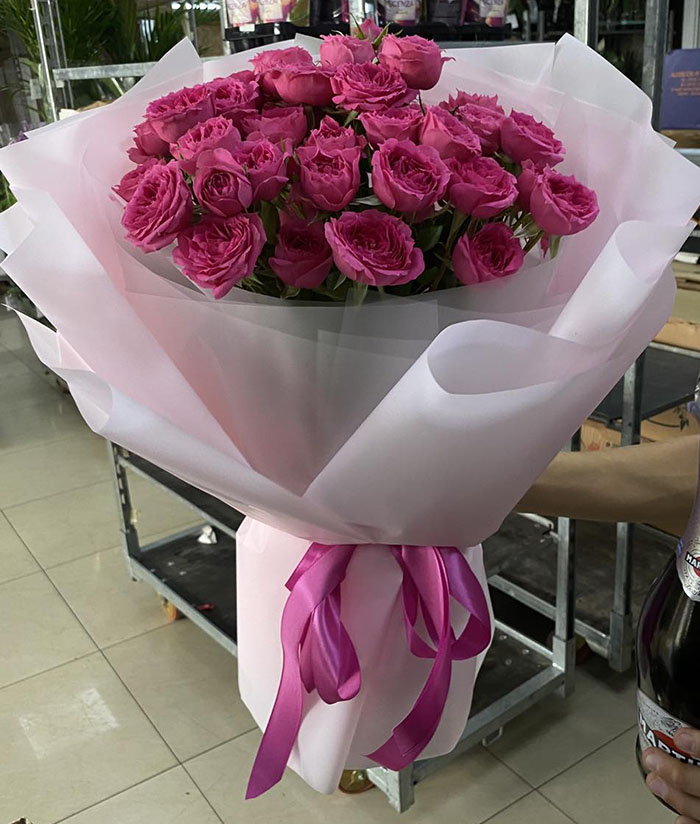 На нашому фото представлений букет з 35 стебел піоноподібних троянд кущових Бомбастик, але в букетi не менше 100 троянд!