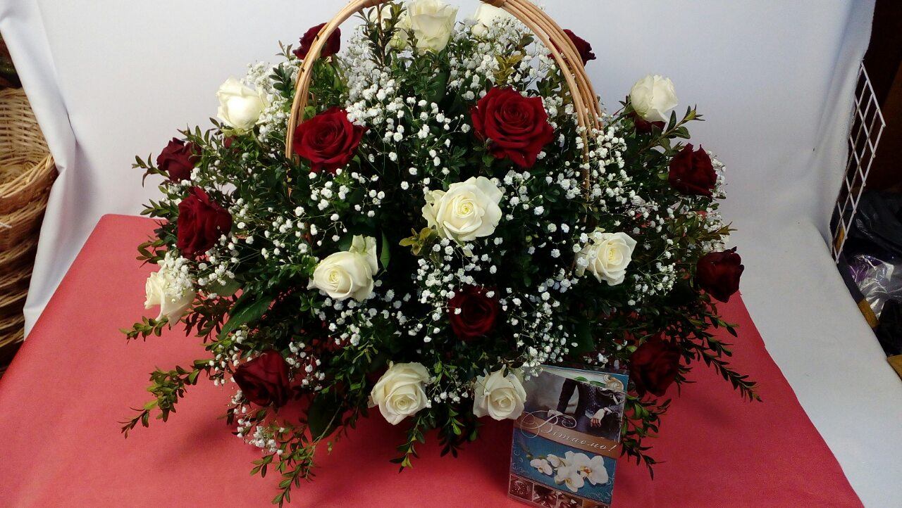 Композиція з червоних і білих троянд в кошику для мемориальних заходiв.