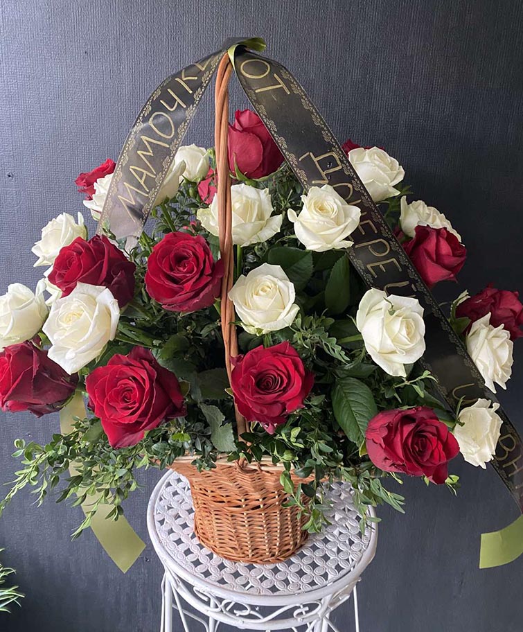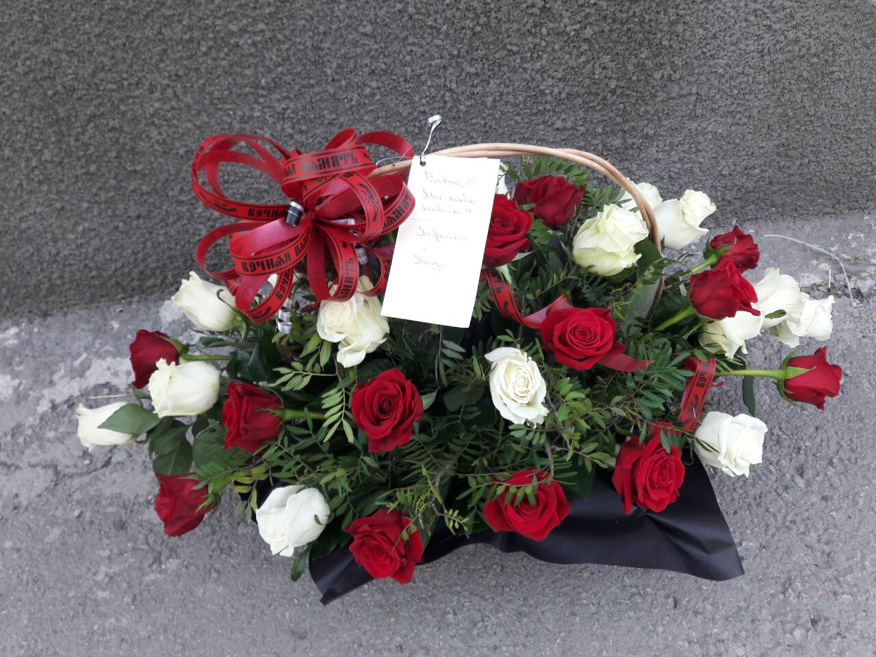 Композиція з червоних і білих троянд в кошику. Будь ласка виберiть розмiр композиції за загальною кількістю троянд у ній