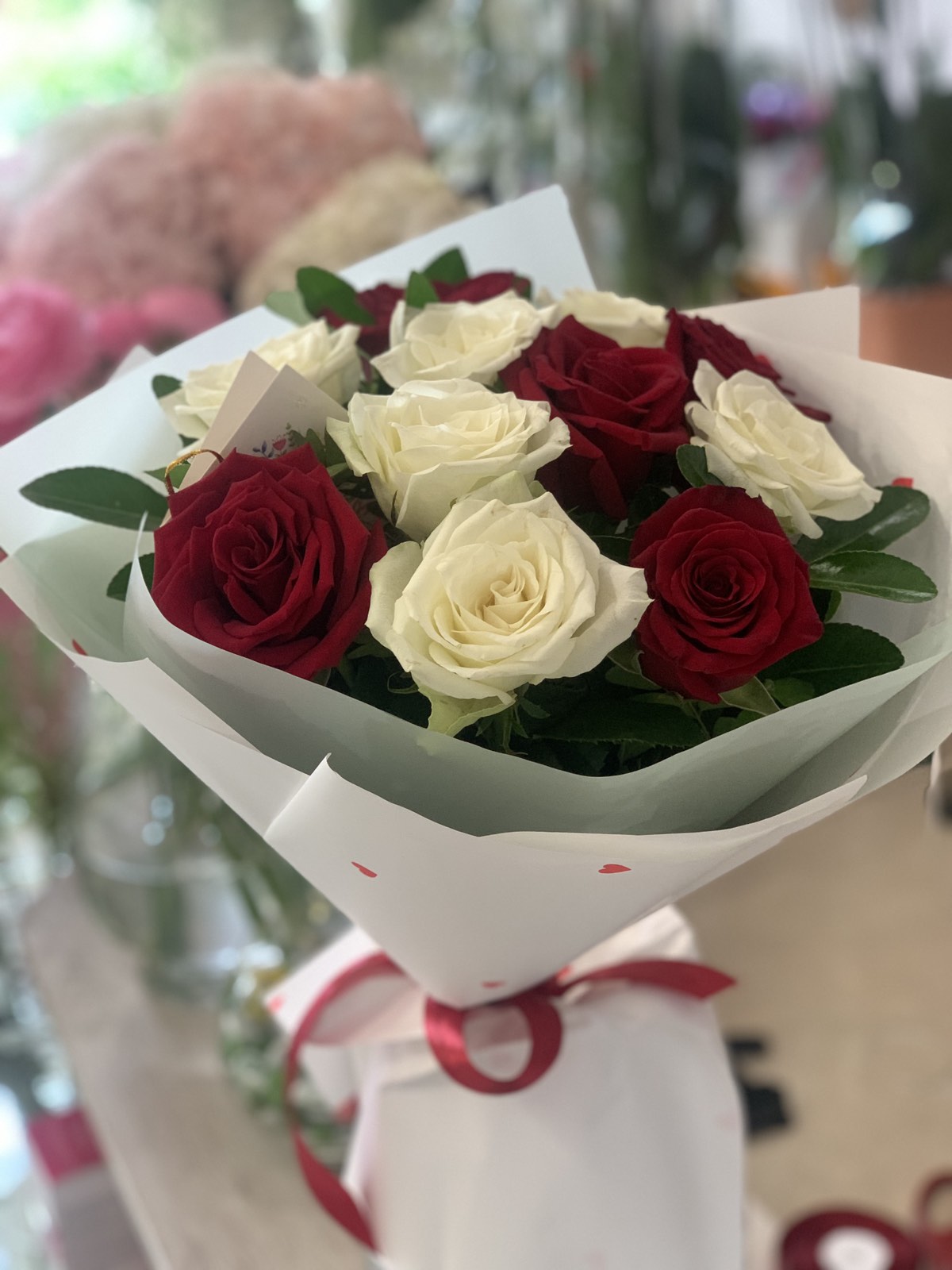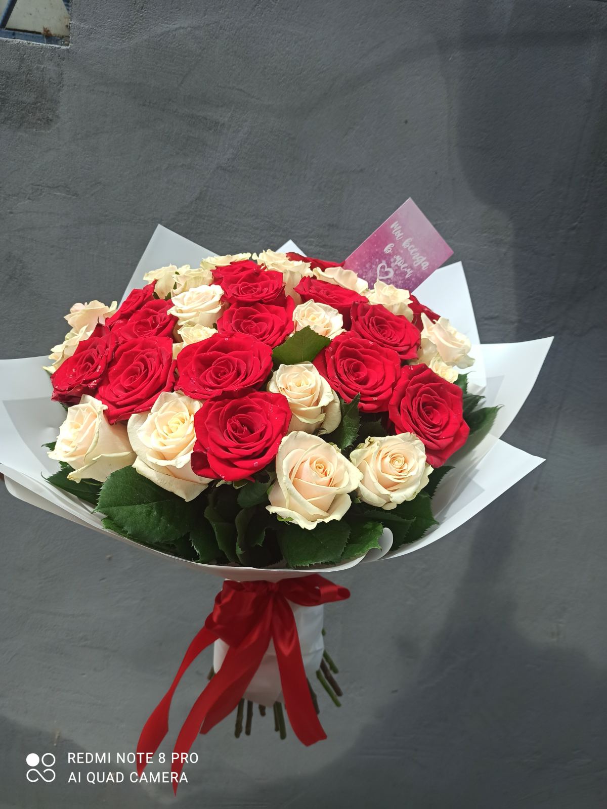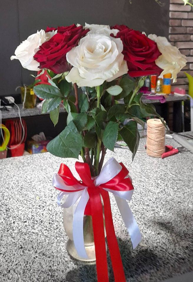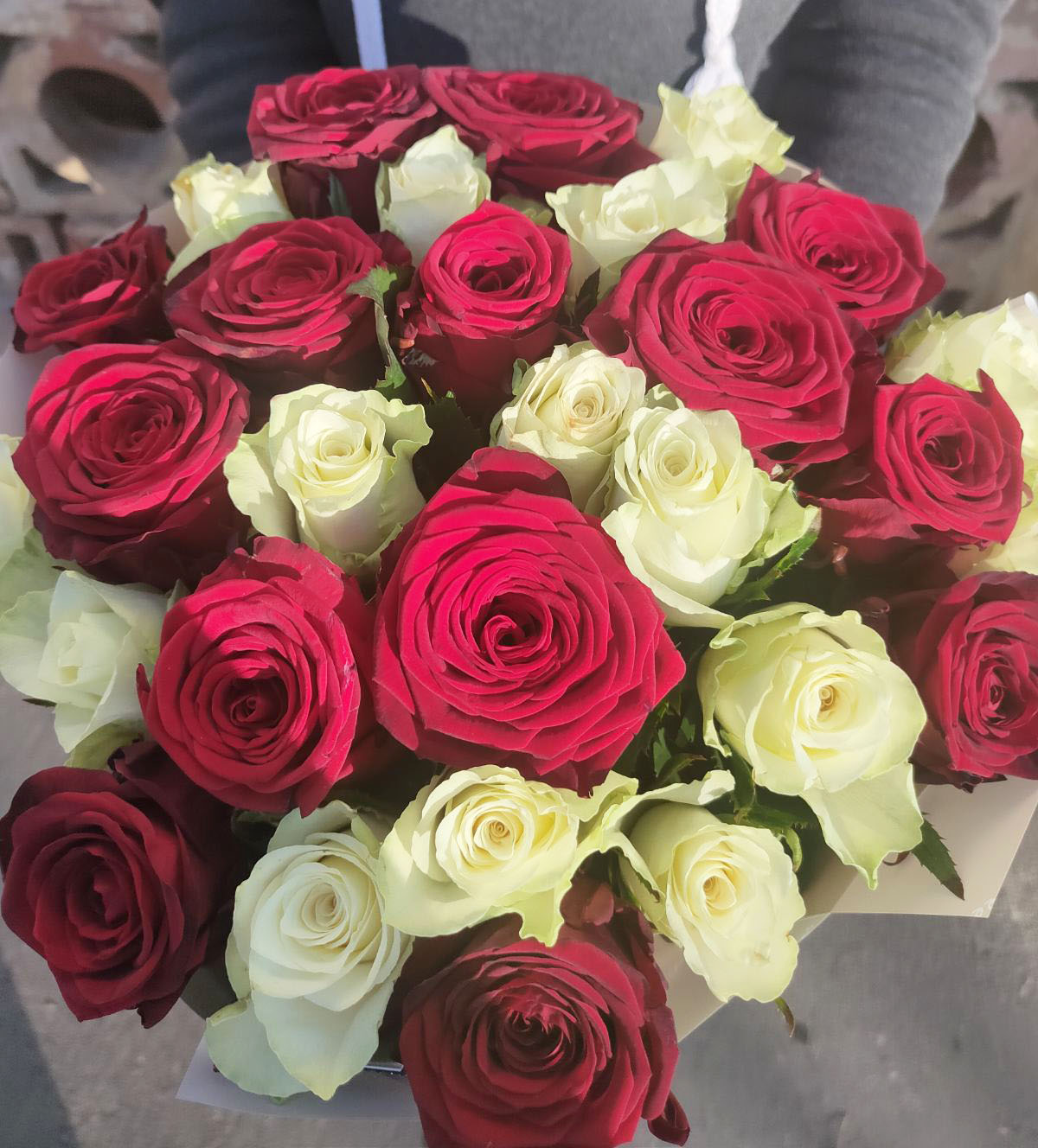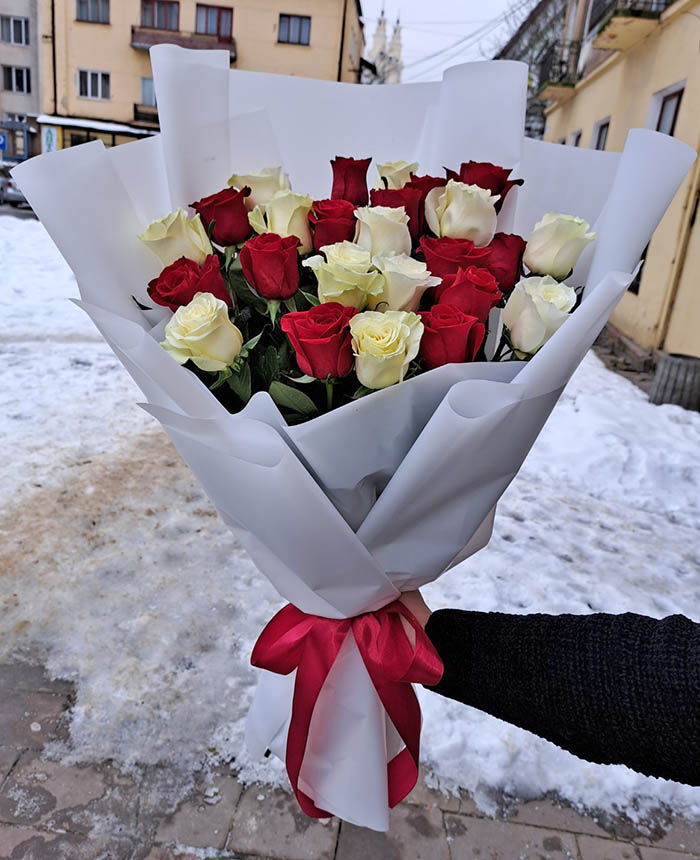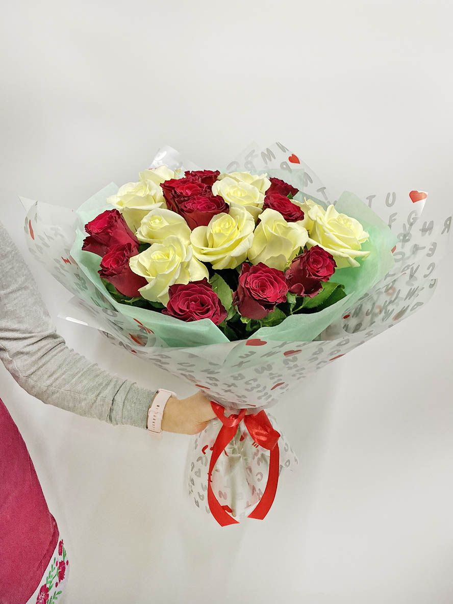 Гарно оформлений букет з рівної кількості червоних і білих класичних троянд. Це троянди кращих Голландських сортів, але вирощенi в Україні. Довжина стебла - 60-70 см.