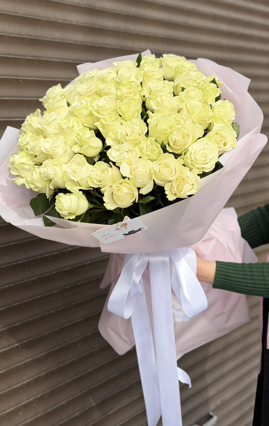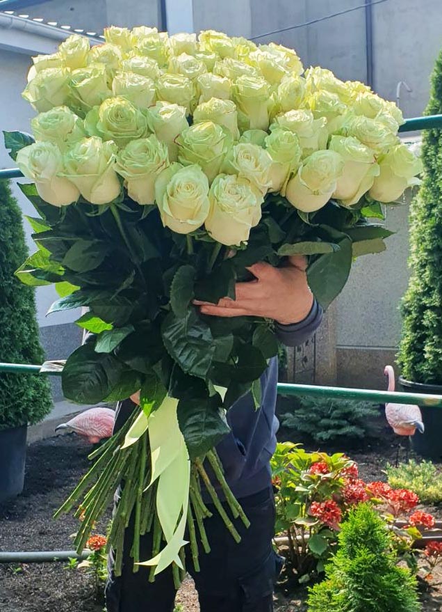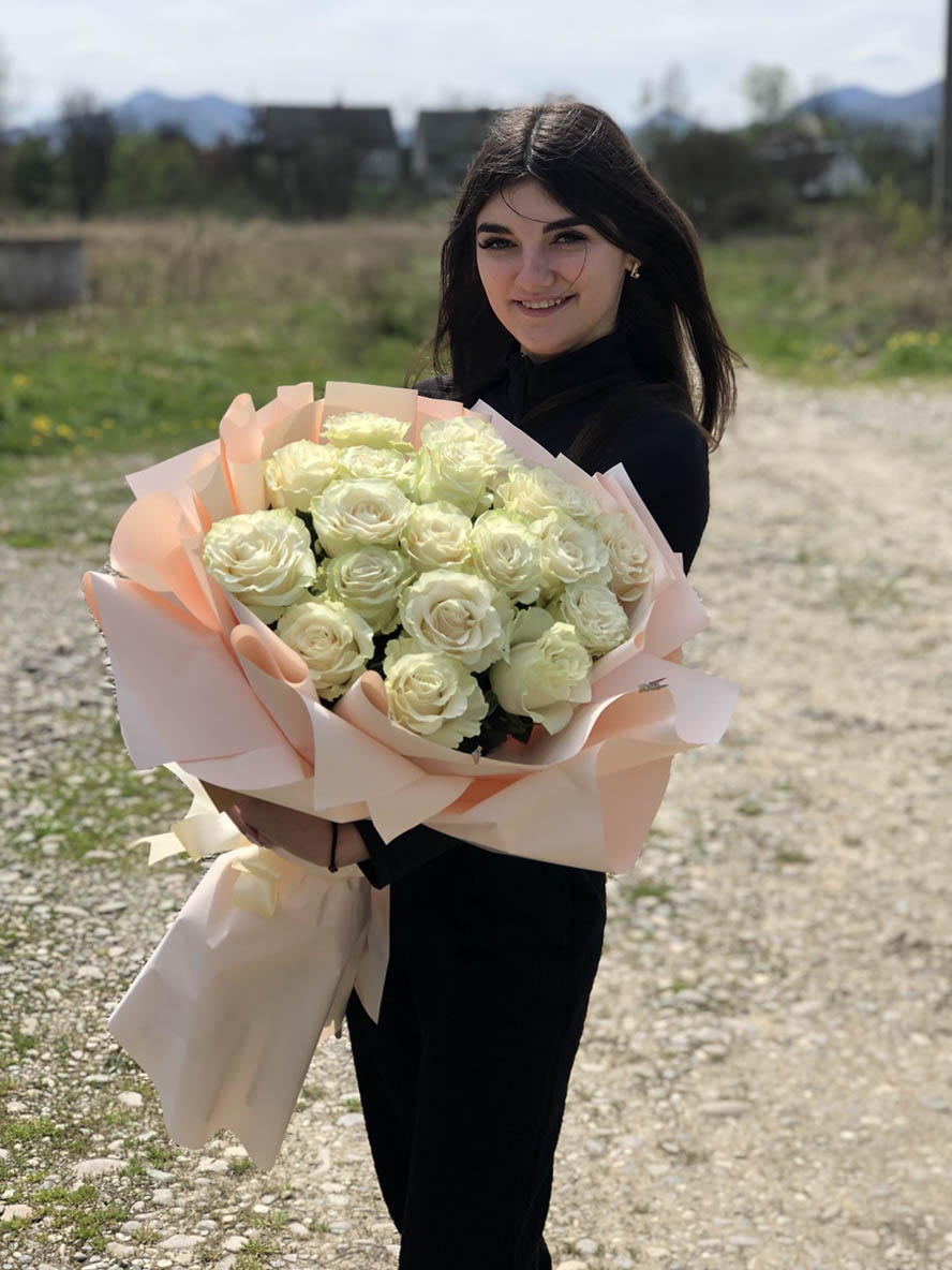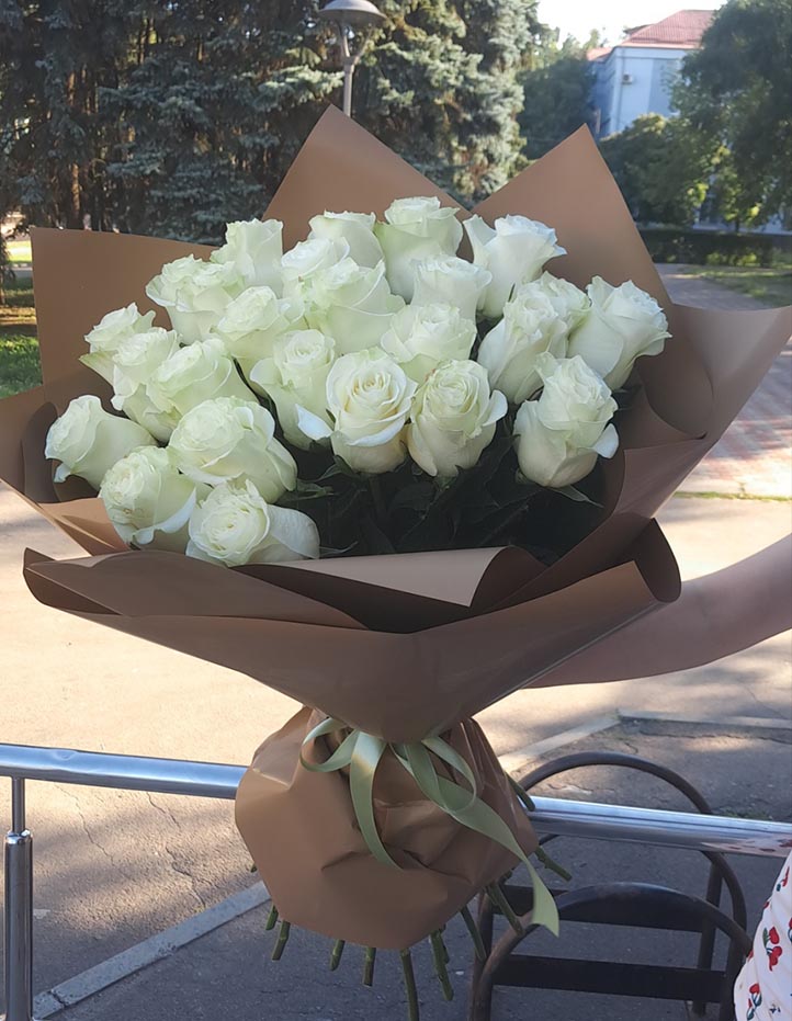 На цій сторінці можна замовити такий букет з білих троянд з довжиною стебла 80-90 см з Голландії або Еквадору.