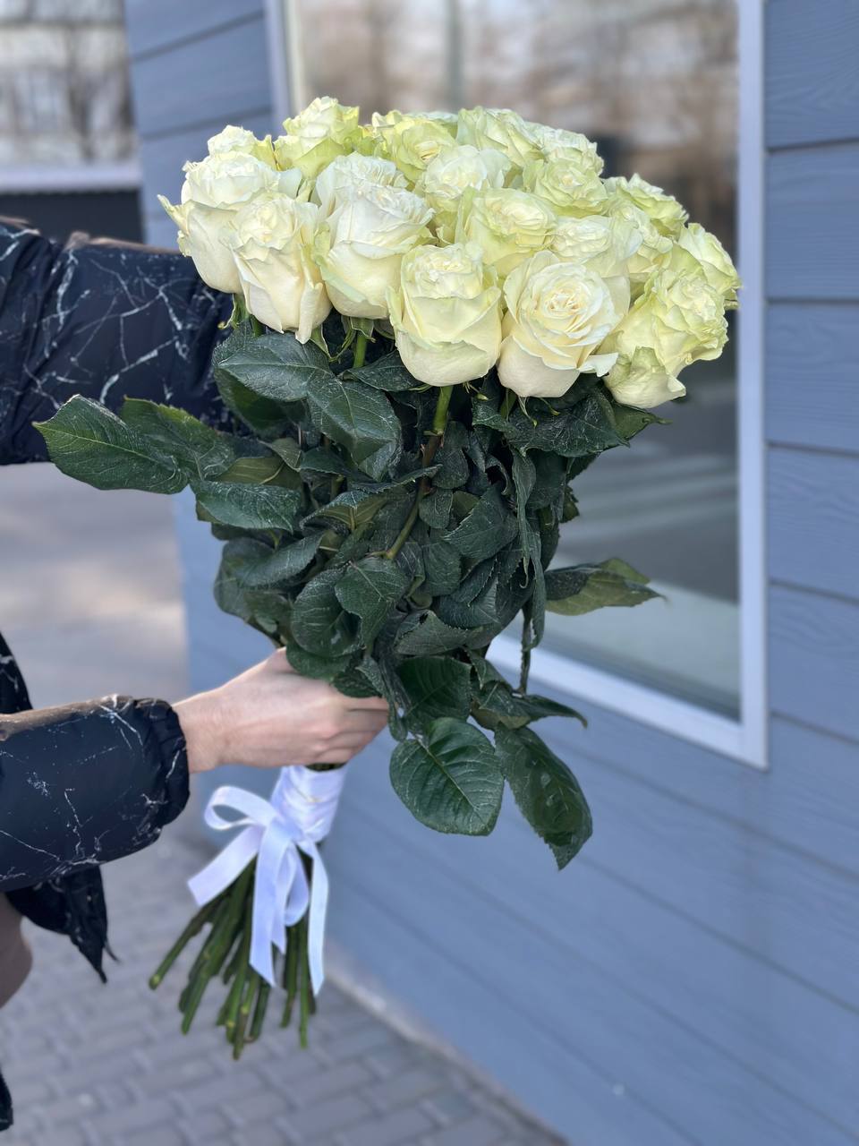 Білі троянди - символ вірності і чистоти. Букет білих троянд зі стеблом 80-90 см включає прекрасні троянди з великими бутонами, гілки декоративної зелені, ніжну гипсофилу (при наявності), а також сучасну дизайнерську упаковку, що підкреслює неперевершену красу букета як твори мистецтва флористики.