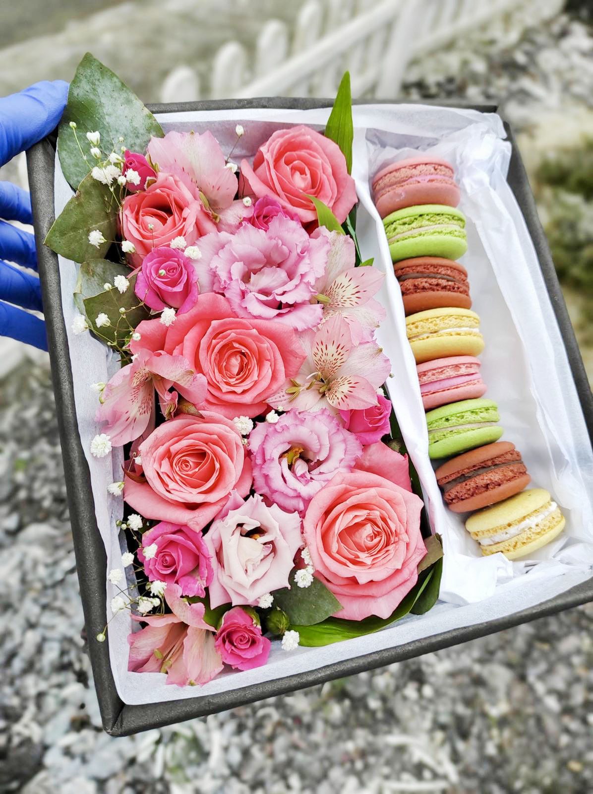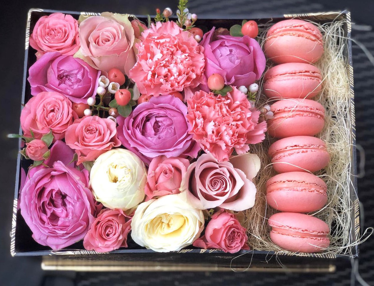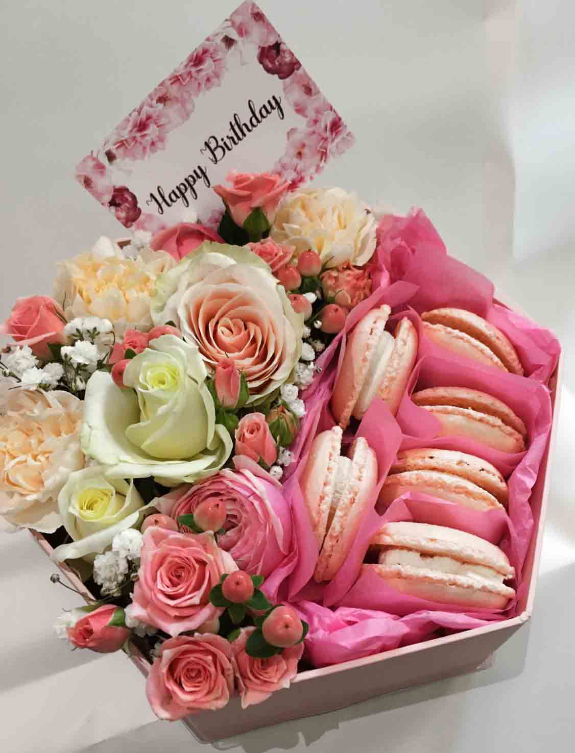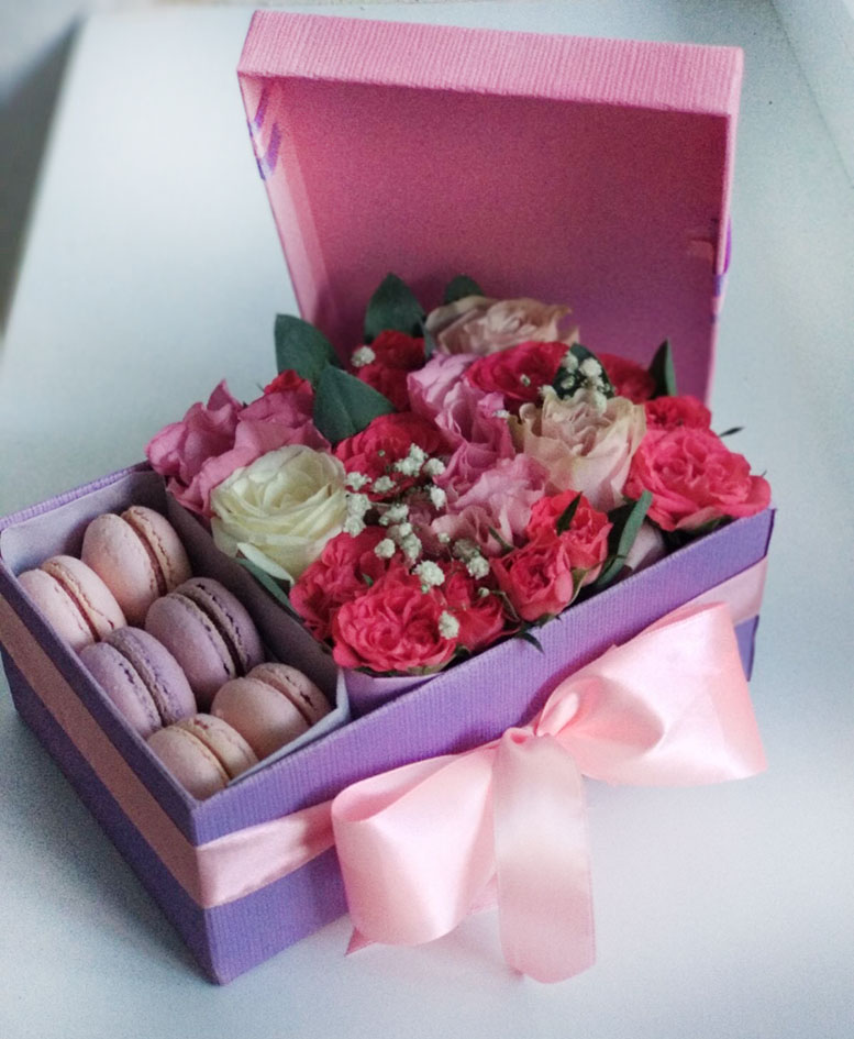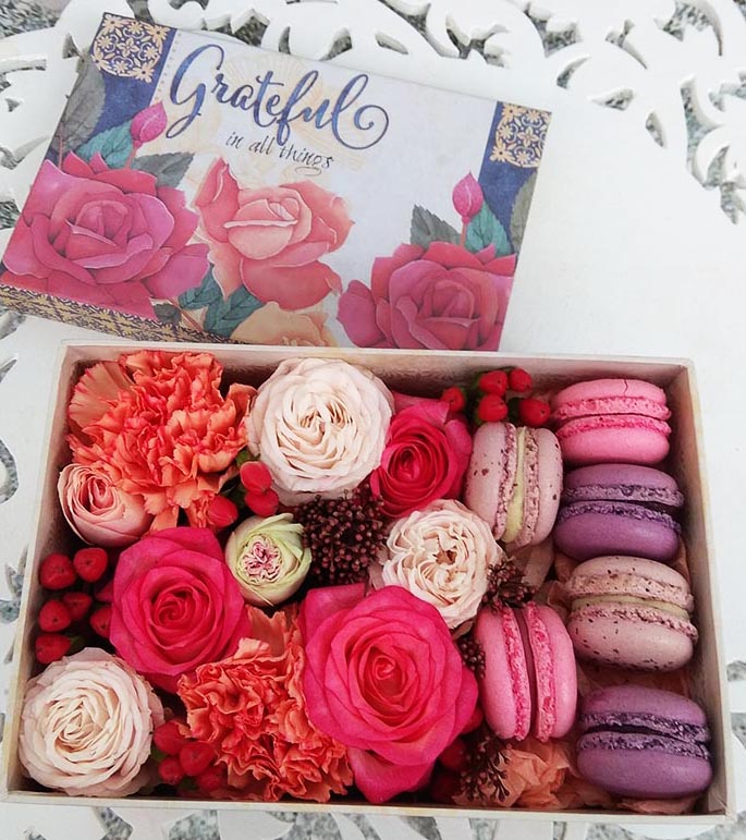 Ніжні квіти в рожевих тонах на оазисі і смачне ласощі - французьке печиво макаронс.