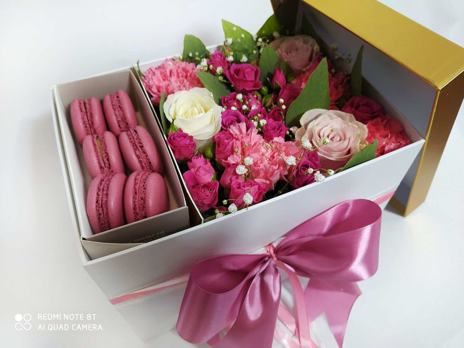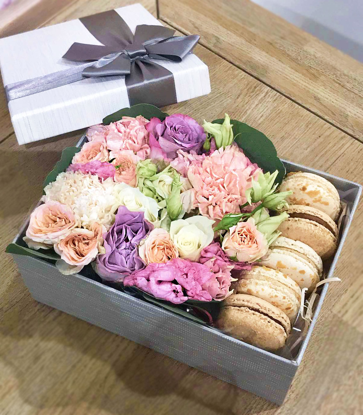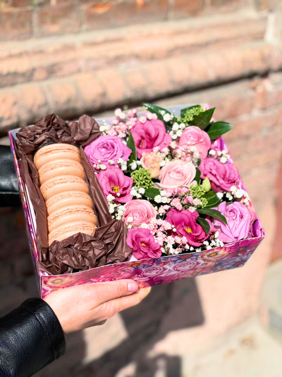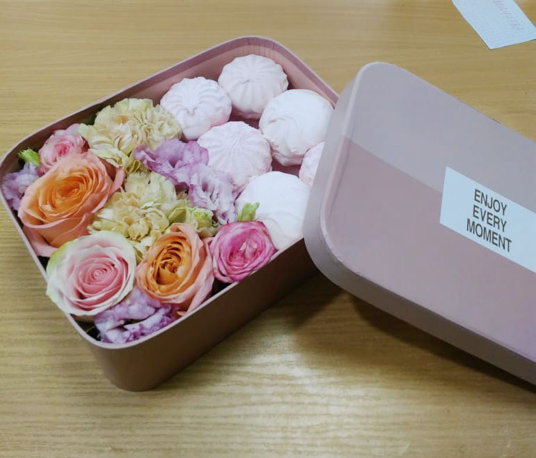 Ніжні квіти в рожевих тонах на оазисі і смачне ласощі - французьке печиво макаронс.