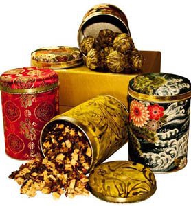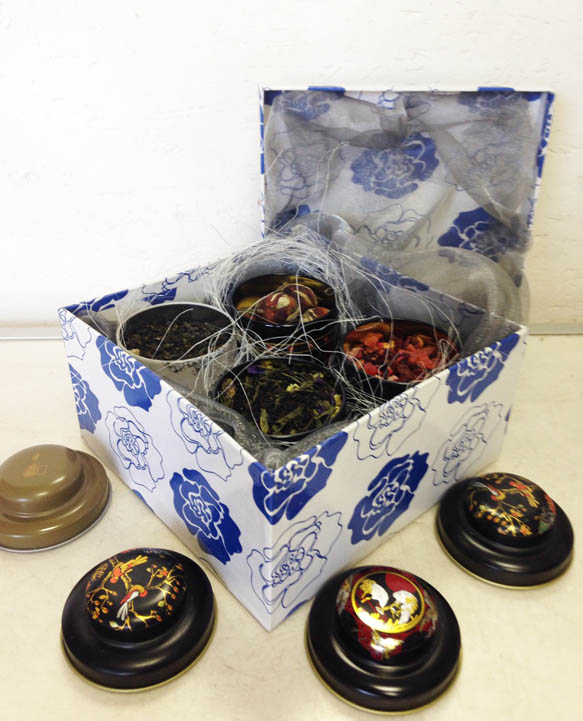 Тут 4 металеві банки, в три з яких входить по 80 або 150 грамів елітного китайського чаю (в залежності від вашого вибору "середня" або "велика" упаковка), а 4-й банку - 8 або 16 бутонів пов'язаного чаю 3-4 видів . Для заварки одного чайника потрібно всього один такий кулька-бутон і кожен з низ дасть прекрасну квітку, несхожий на інші. Адже вони в'яжуться вручну, тому кожна квітка можна вважати предметом мистецтва