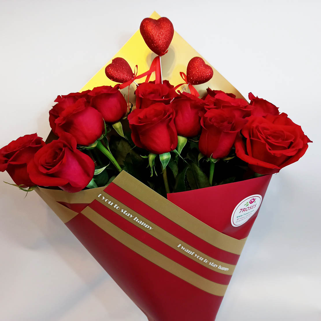 Traditional Red roses bouquet with the decorative hearts expresses the feelings absolutely clearly